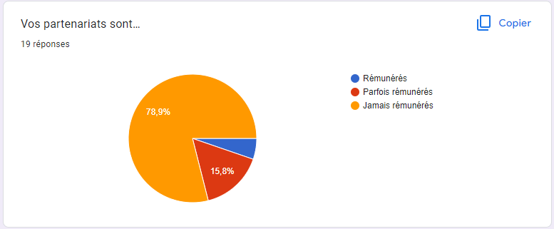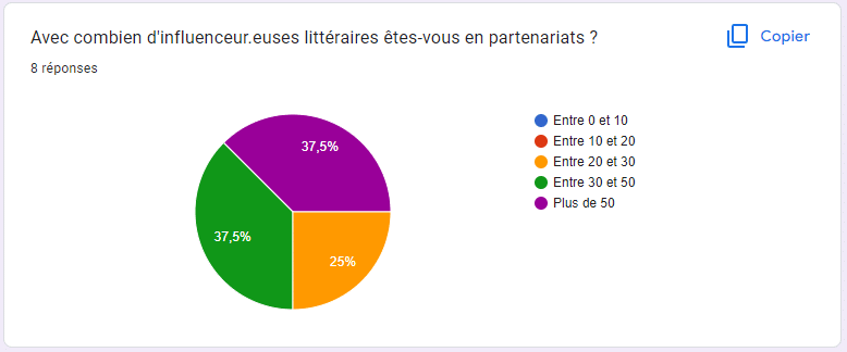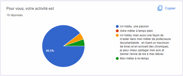 Pour 89,5 % des personnes ayant répondu au questionnaire, leur activité sur les réseaux sociaux est un passe-temps. Quelques-uns d’entre-eux en ont fait leur métier à temps plein ou à temps partiel. Lorsqu’un influenceur littéraire a réussi à prouver sa légitimité sur Instagram, les maisons d’édition peuvent s’intéresser à son profil afin de lui envoyer gratuitement certaines de leurs futures parutions pour qu’il en parle ensuite sur ces réseaux sociaux.
